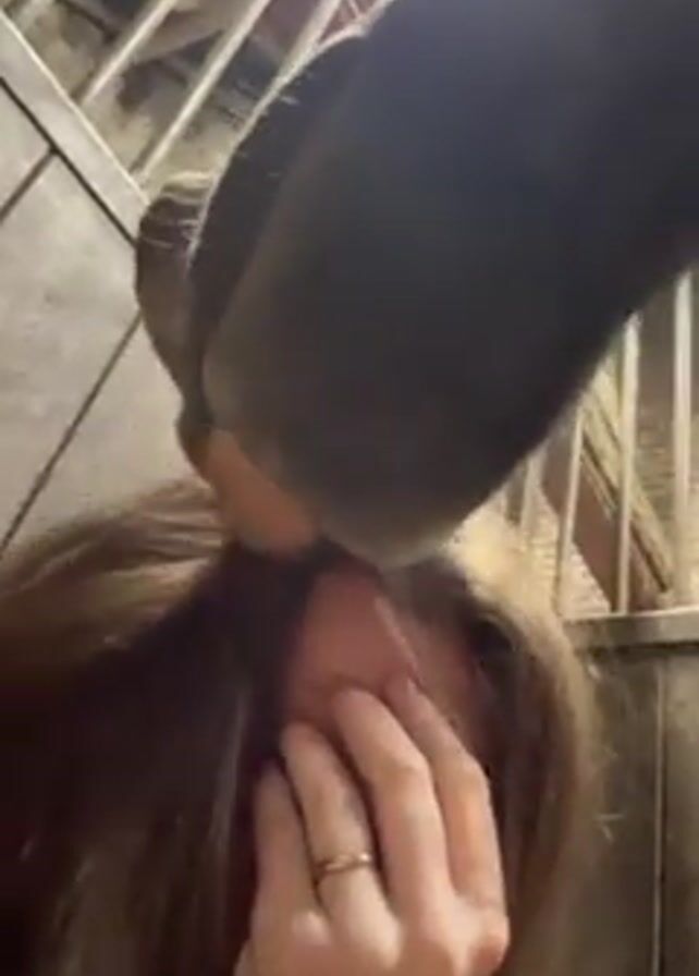 woman with long brown hair standing in what appears to be a stable or barn. She has her hand on her forehead and appears to be distressed. A large, dark-colored animal, likely a horse, is very close to her, with its head hovering over her. The animal's muzzle is visible. The background includes wooden walls and a metal gate or bars. The lighting is somewhat dim and artificial. The woman is wearing a ring on her finger.