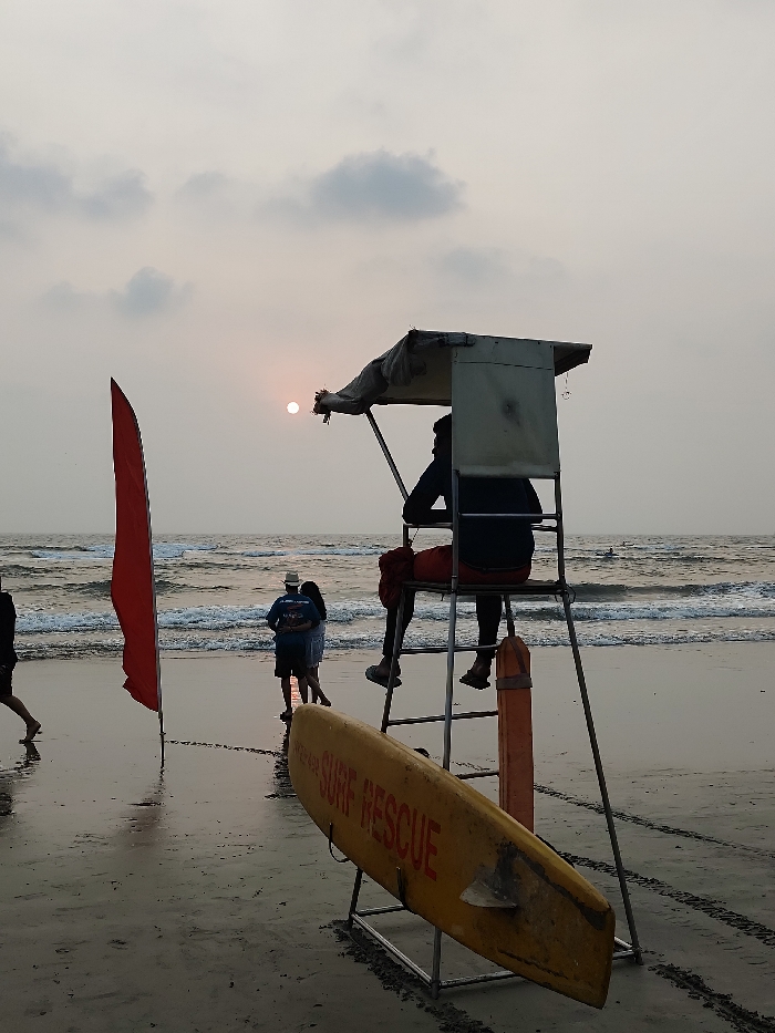 The image depicts a beach scene at sunset in Arambol, India. In the mid-right foreground, a lifeguard is seated in a tall, metal lifeguard chair, facing the ocean. The individual is silhouetted, wearing dark upper body clothing and red shorts. Below the chair, a yellow surfboard with "SURF RESCUE" printed in red text rests on a metal stand. The beach consists of wet sand reflecting the sky, with visible tracks. To the left of the lifeguard station, a tall, vertical red flag is planted in the sand near the water's edge. Further left, two individuals are standing close to the breaking waves, appearing to embrace or interact. One individual wears a hat. A third, partially visible person is walking towards the left along the shoreline. The ocean displays gentle waves. The setting sun, a bright white disc, is positioned low on the horizon, slightly left of the lifeguard station, against a hazy, pale gray sky with scattered clouds.