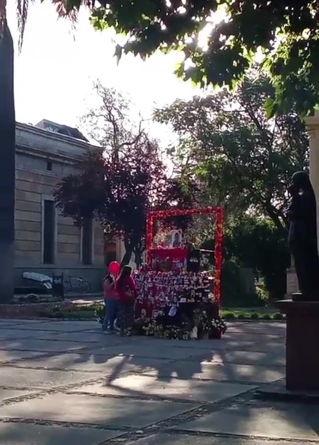 A low-angle shot captures a brightly sunlit memorial or shrine in a graveyard or park-like setting. Two individuals stand before the shrine, a woman in a red shirt and blue jeans holding a red balloon, alongside a younger girl wearing a pink top and dark pants. The shrine is decorated with red frames, flowers, pictures, and small objects. It's placed on a paved surface marked with a grid pattern. A bicycle leans against a nearby building with a closed door. To the right, a dark statue stands atop a pedestal. The foreground is dominated by the shadows of tree branches with green leaves, filtering the sunlight. A tall palm tree is visible to the left, enhancing the park-like atmosphere.