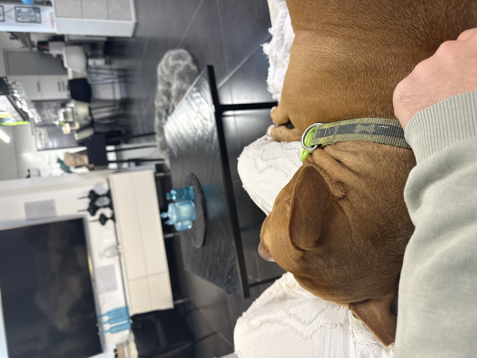- "A close-up angled shot shows a brown dog, possibly a pit bull, resting on a white, textured cushion" by FM-VbiQq1, licensed under CC BY 4.0