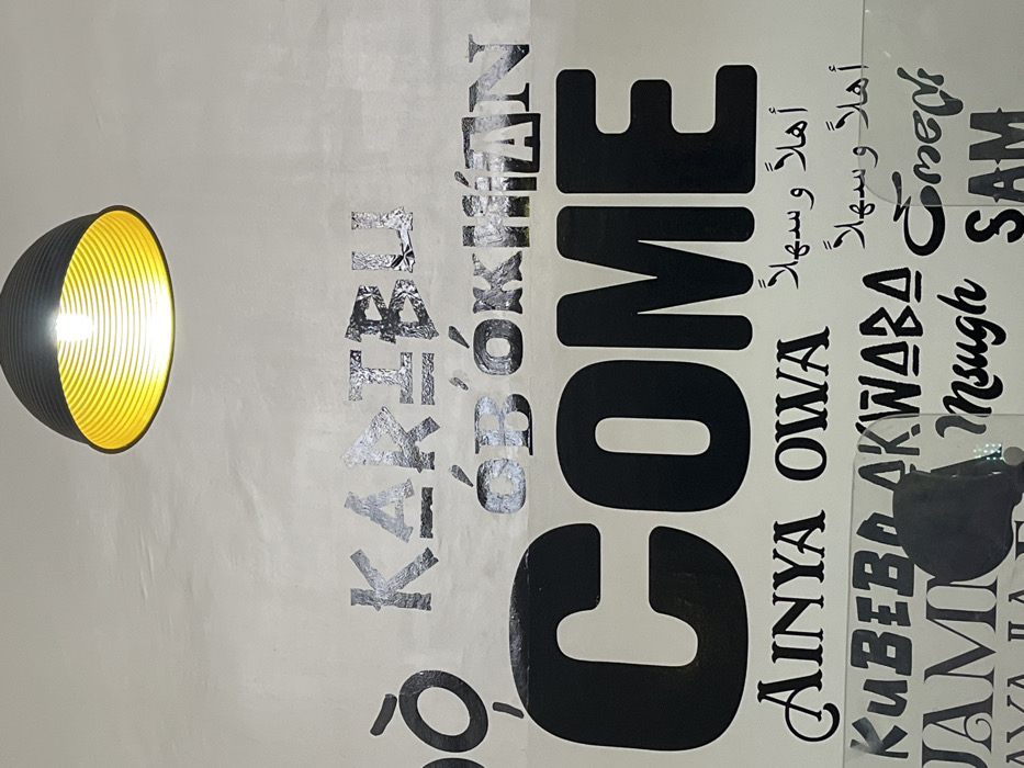 The image displays an interior wall, primarily light beige or off-white, featuring several "welcome" greetings in multiple languages. A black, ribbed, dome-shaped pendant light fixture with a yellow interior and an illuminated bulb hangs from the ceiling in the upper center. On the wall, text is arranged in horizontal lines. The upper visible line includes "KARIBU" and "ÓB ÓKHIÁN" rendered in a distressed, silvery-metallic font. Below this, a large, bold, black "COME" dominates the central area. Further down, "AÍNYA OWA" is written in a black cursive font, adjacent to two instances of "أهلاً وسهلاً" in Arabic script. A subsequent line displays "KUBEBO AKWABA" in a black, blocky font, with additional fragmented words such as "JAMÎN," "Msúgh," and "SAM" partially visible at the bottom. A dark, indistinct, curved shape is present at the bottom center, obscuring parts of the lowest text lines. No individuals are discernibly depicted. The specific location within Kaduna, Nigeria, is not identifiable from the visual content.