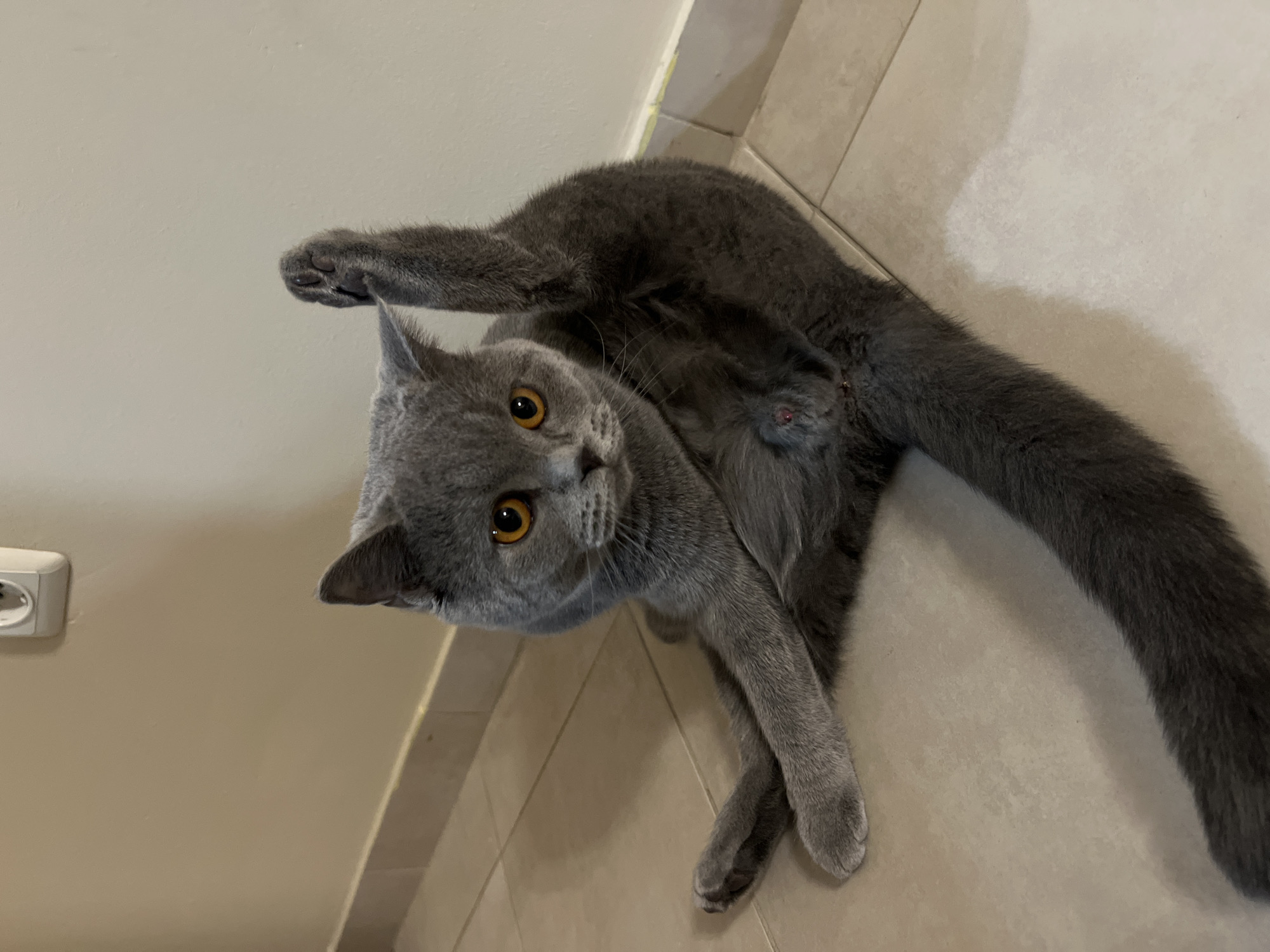 A domestic short-haired cat, possessing solid grey fur and amber irises, is depicted seated on a tiled floor within an indoor residential setting in Sofia, Bulgaria. The feline adopts a distinctive posture where its left hind leg is extended vertically upward, exposing the paw pad and ventral abdomen area, while its right hind leg is flexed and positioned forward on the floor. Its head is turned, and its gaze is directed forward, engaging the viewer directly. The floor consists of light-colored, square ceramic tiles with visible grout lines. The background features a plain, light beige wall, bordered by a matching skirting board at floor level. A white, twin-socket electrical outlet, consistent with European standards, is mounted on the wall in the upper right quadrant of the frame. The scene is illuminated by ambient indoor lighting, casting subtle shadows.