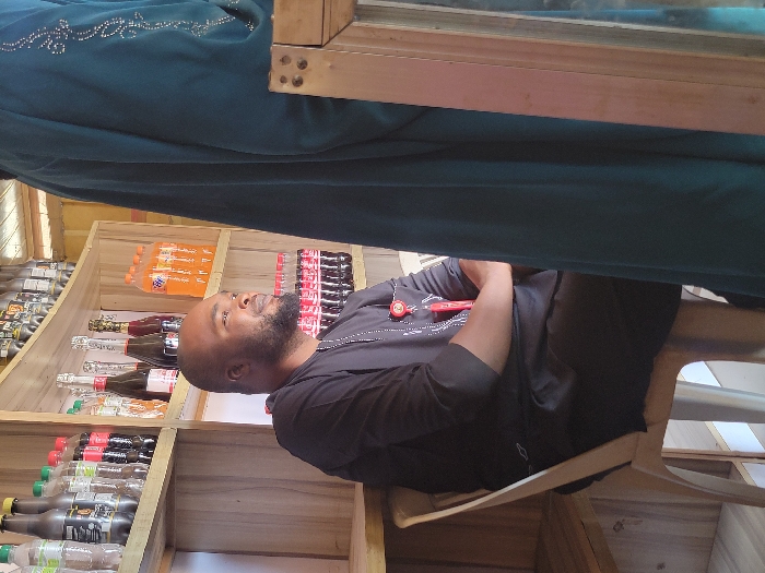 The image portrays an indoor scene in the city of Gura Top, Nigeria, within what appears to be a beverage retail establishment