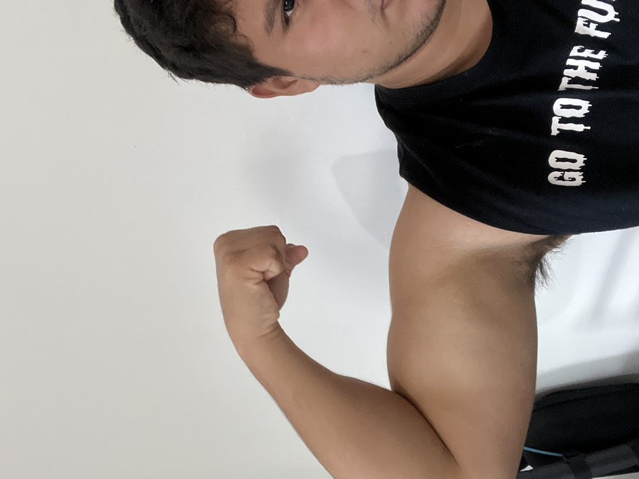 The image displays a male individual from the mid-chest level upwards, positioned against a plain, light-colored wall. The subject has dark hair and visible facial stubble. He wears a black sleeveless t-shirt with partially visible white, dripping-style text that reads "GO TO THE FU..." on the right side of his chest. His right arm is bent at the elbow, with the hand clenched into a fist, prominently flexing the bicep. Dark hair is visible in the subject's right armpit. The environment consists solely of the unadorned wall, providing no specific geographical identifiers to indicate a location in Komchén, Mexico.