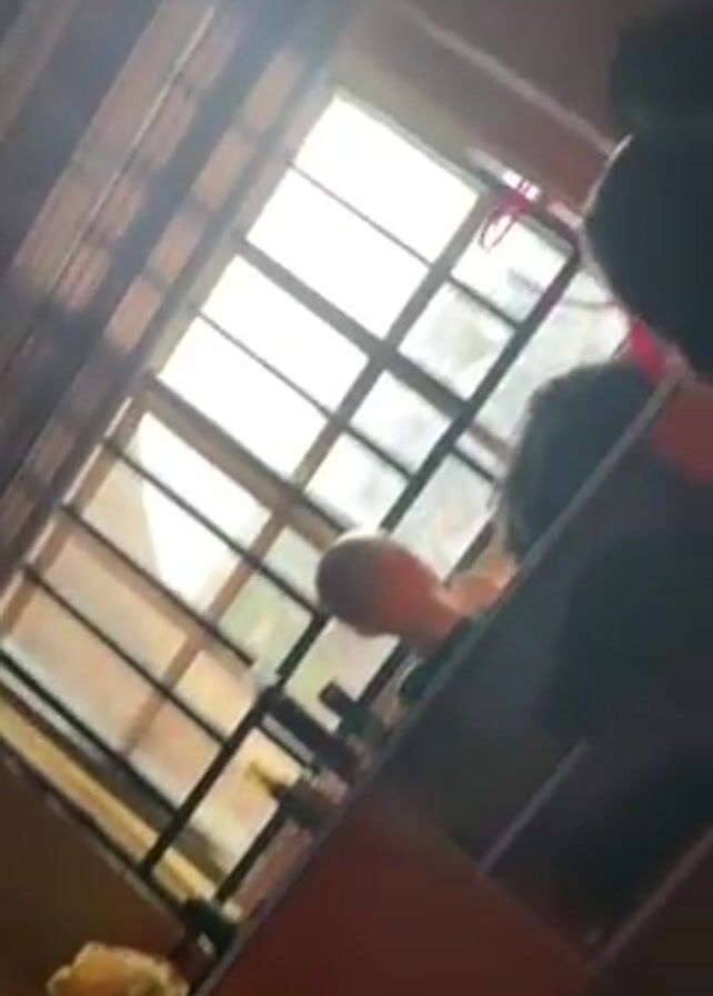 room with a window covered by blinds. Outside the window, some greenery is visible. In the room, there's a cabinet with an orange door. On top of the cabinet are various items, including a mannequin head and some bottles. The camera angle is tilted upwards. The ceiling appears to have a textured or patterned surface. The video is somewhat shaky.