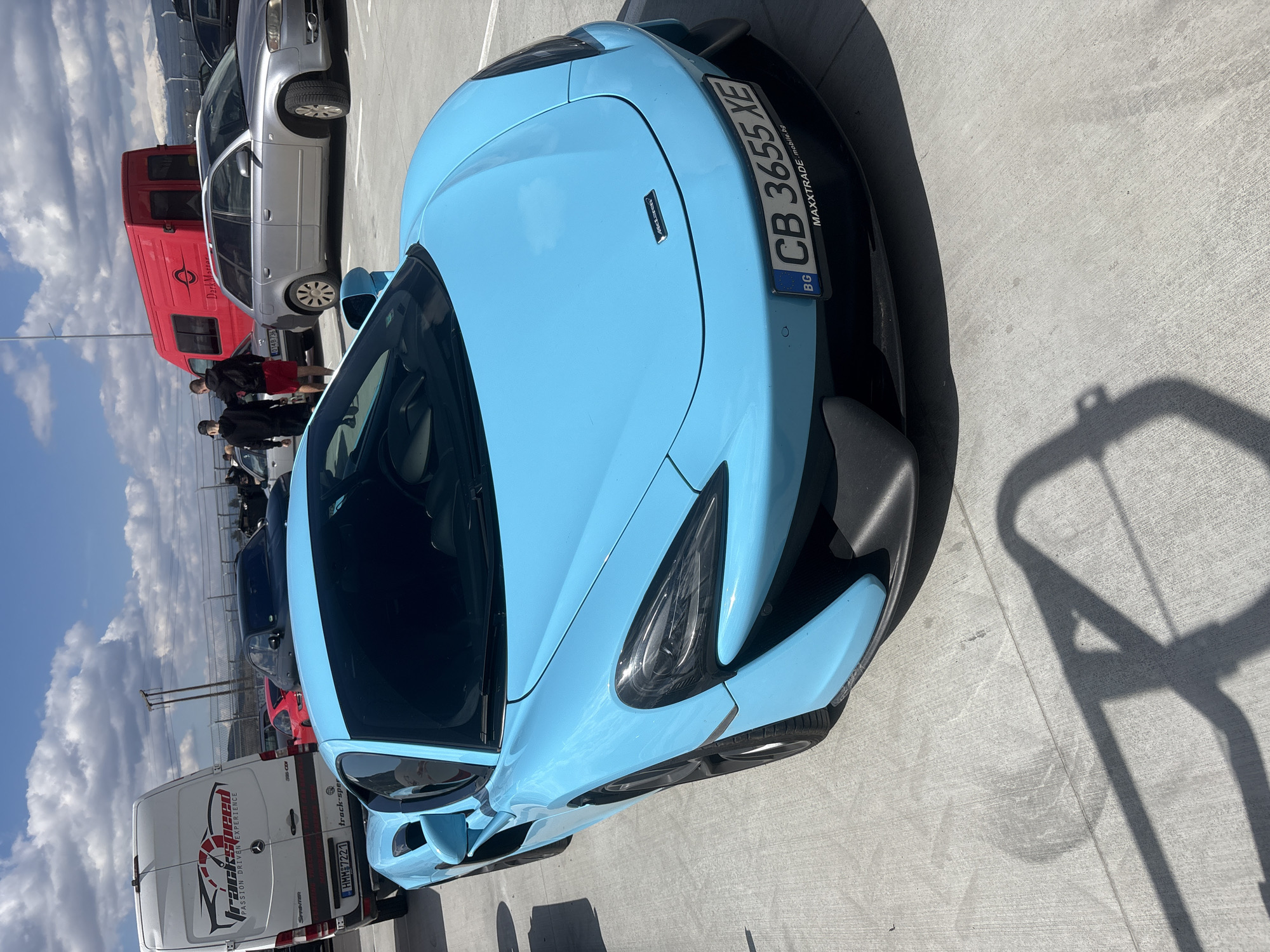 light blue McLaren parked on a concrete surface. In the background, there are several other vehicles including a white van with "Track Speed" and "Passion Driven Experience" written on it, a red van with "Dark Matter" written on it, and a silver car. Several people are visible standing near the vans. The license plate of the McLaren reads "CB 3655 XE" and indicates registration in Bulgaria with the text "MAXXTRADE.mobile.bg" printed beneath. The sky is visible with some clouds. It is daytime, with a long shadow present on the concrete. There is no explicit indication of the city Dospey, Bulgaria.