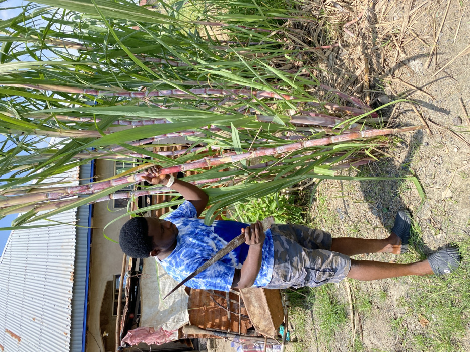 An outdoor scene in Lokoja, Nigeria, depicts a young adult male examining sugarcane