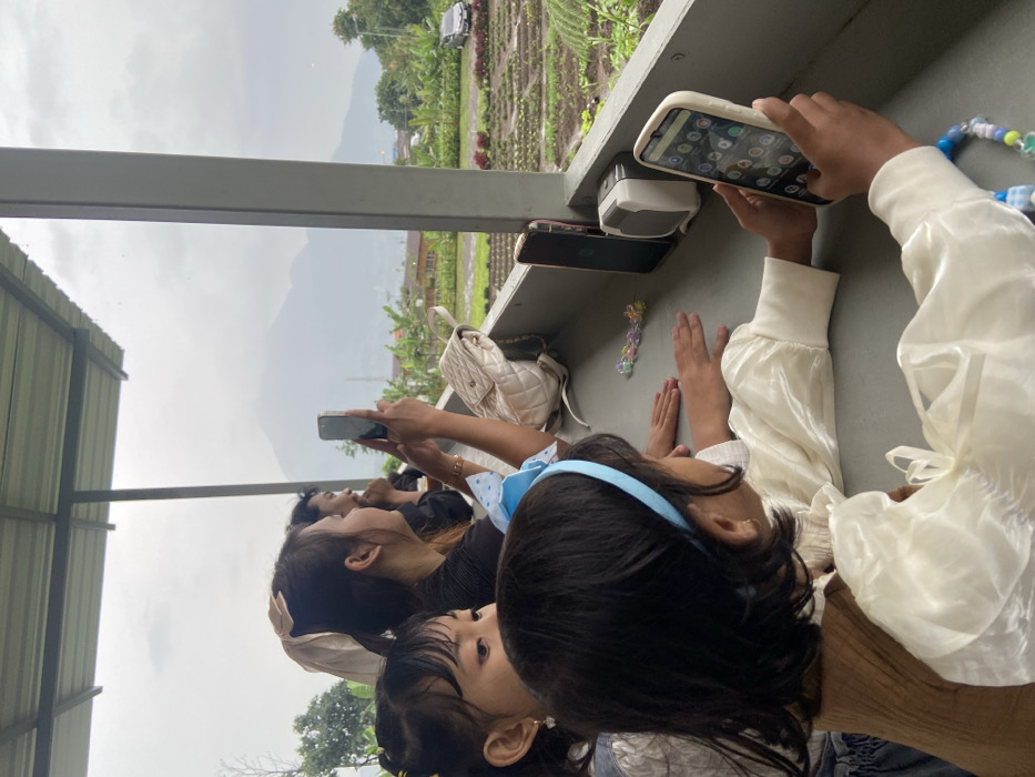 Several people are taking photos of a landscape using their cellphones. The landscape consists of farmland and a distant mountain range under a cloudy sky. A white quilted backpack and a small printer rest on a concrete ledge, along with at least two phones. A blue beaded necklace lies next to a person's hands wearing a white long-sleeved shirt. The people include adults and children. The scene is partially shaded by a structure with a corrugated metal roof.