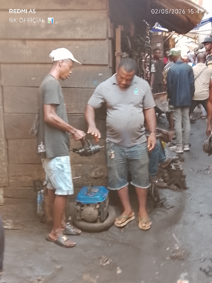 Two men stand in a crowded outdoor market. The younger man, wearing a cap and casual attire, holds a mechanical part, presenting it to the older man, who is also casually dressed. A small, blue engine rests on a tire at their feet. Other people mill about in the background. The ground appears dirty and the overall setting suggests a busy, somewhat rundown commercial area. The date and time "02/05/2026 15:47" are stamped in the upper right corner.