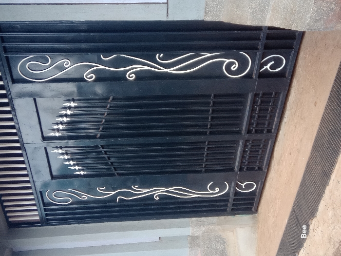 The image displays a closed dark grey or black metal double gate, located in Nyeri, Kenya