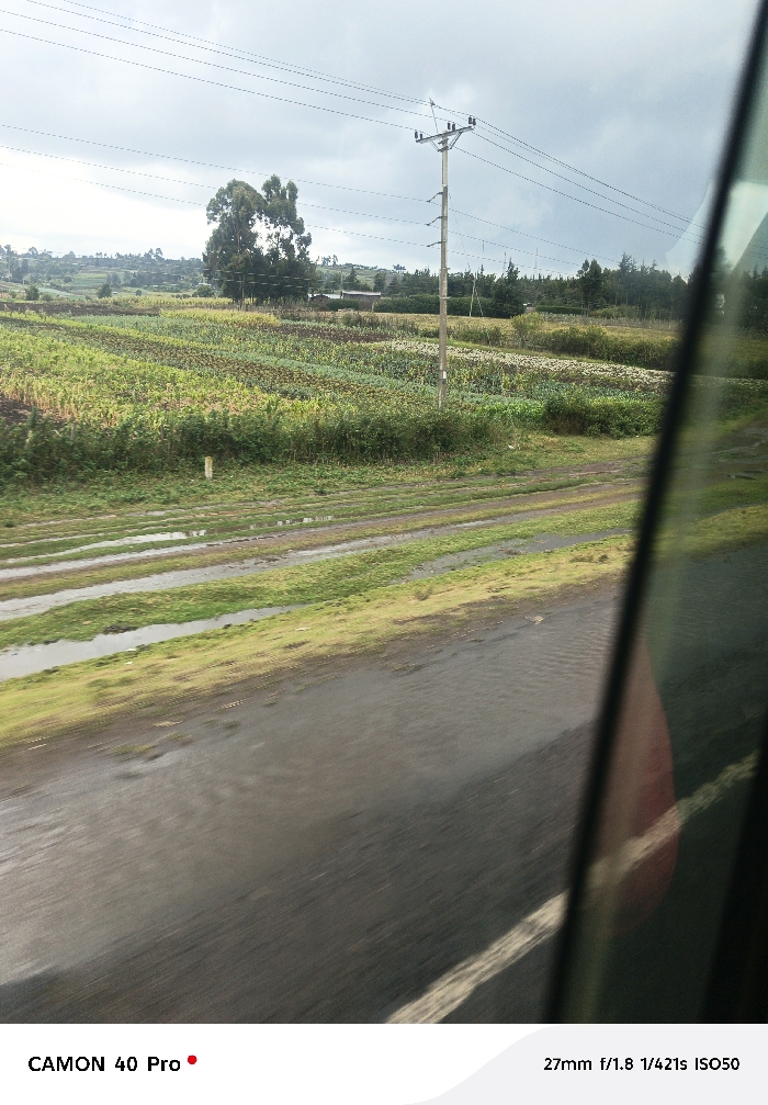 The image captures an outdoor landscape from the perspective of a moving vehicle, evidenced by motion blur on the foreground road and a partial reflection on a dark vertical frame at the right. The immediate foreground features a wet, dark-colored paved surface, possibly a road, with a faint white line visible. To the left, a muddy dirt track with multiple parallel ruts, some containing standing water, runs alongside the paved area. Beyond the track, expansive agricultural fields are visible, showing various rows of green and brown cultivated crops. A white marker post is present within the vegetation between the dirt track and the fields. A utility pole with multiple overhead wires stands prominently in the midground. In the background, rolling hills are covered with further cultivated land, scattered trees, including a large deciduous tree, and several indistinct small structures. The sky is overcast with grey clouds. This scene is situated in the Naivasha East ward, Kenya.