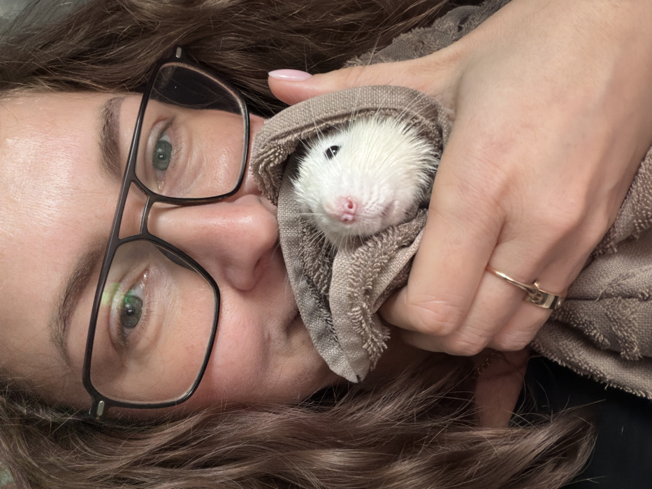 The image depicts an adult female in a close-up, chest-up shot, holding a small, white-furred animal wrapped in a light brown towel. The scene is located in Dubovaya, Russia. The female has visible long, wavy brown hair, wears black-framed eyeglasses, and possesses light-colored eyes. Her nose and a portion of her upper lip are visible; her mouth is largely obscured by the towel. Her left hand holds the towel and animal; a simple gold-colored ring is present on her left ring finger, and her fingernails are manicured with light pink polish. The animal, which appears to be a small rodent, has a pink nose, small dark eyes, and visible whiskers, with its head emerging from the towel. The background is indistinct and out of focus, indicative of an indoor setting.