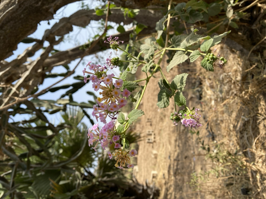 The image displays a close-up view of a flowering plant, identified as Lantana, featuring multiple clusters of small, multi-colored blossoms in shades of pink, yellow, and light purple, interspersed with green leaves. Some flower clusters exhibit developing green fruit. The ground immediately behind the plant consists of dry, reddish-brown soil covered with sparse, desiccated vegetation. In the blurred mid-distance, several stacked concrete blocks are visible. The background includes out-of-focus natural elements: a partial palm tree on the left, a thick tree trunk on the right, and tall, segmented green cacti or similar succulents beneath a clear, light blue sky. The scene is illuminated by direct daylight. The location is an outdoor natural environment in Riyom, Nigeria. No individuals are present, and no active interactions are depicted.