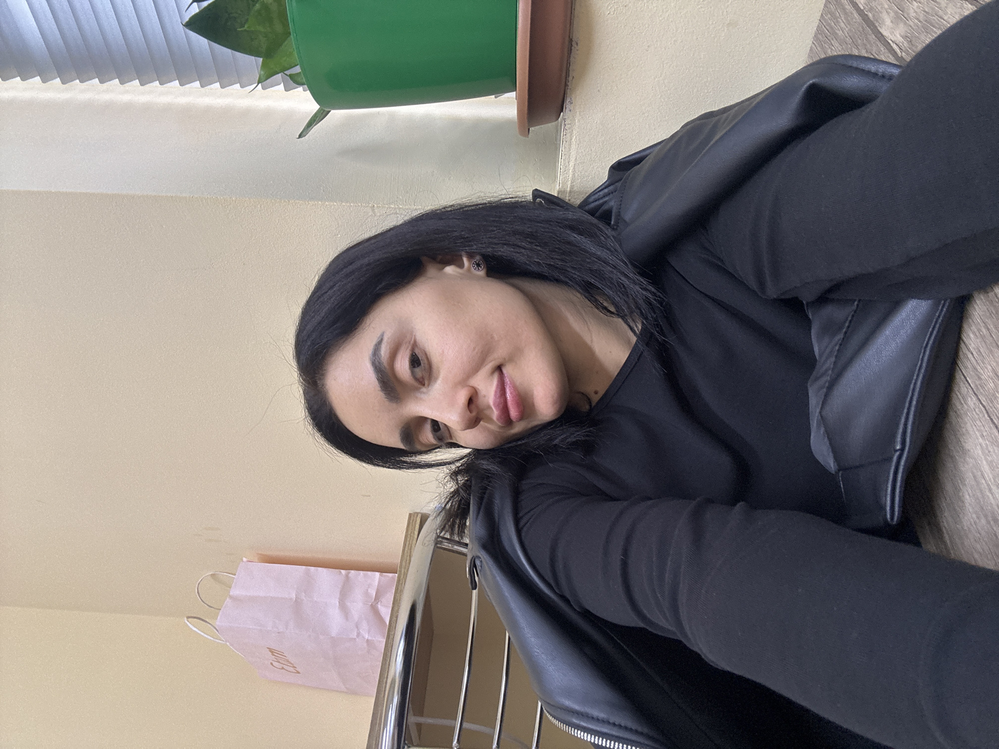 A woman with black hair, wearing a black shirt and leather jacket, is sitting on a chair in a room. A shopping bag is on the floor near a wall, and a green potted plant is hanging near a window with blinds. The photo might be taken in Tbilisi, Georgia.
