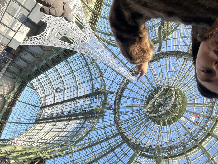 The image captures the interior of the Grand Palais in Paris, France, showcasing its distinctive glass and steel vaulted roof structure with green framework. Bright blue sky is visible through the glass panels. In the bottom left, a person with dark hair, wearing a brown fur coat, is partially visible, posing with pursed lips and pointing upwards with their right index finger. A large, white, open-lattice replica of the Eiffel Tower stands prominently in the mid-ground on the right. Another person, seen from behind wearing a grey beanie and a dark puffy jacket, is positioned near the base of the Eiffel Tower replica, facing towards it. Several circular truss structures and suspended lighting rigs are visible beneath the glass ceiling, suggesting an event setup.