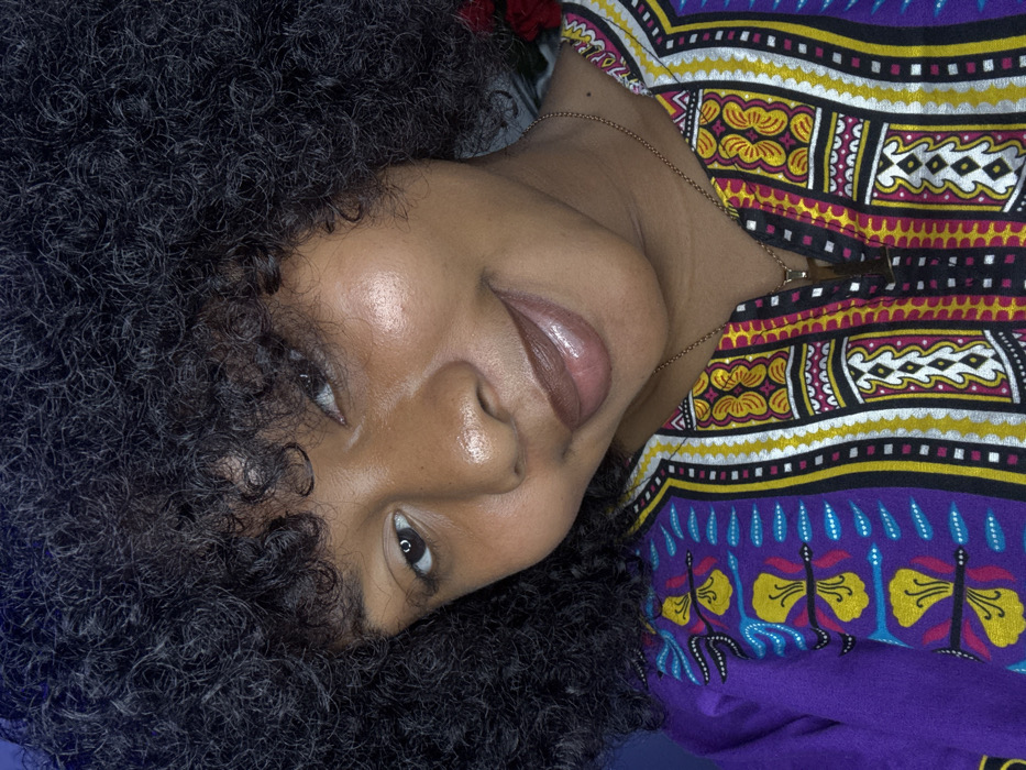 A close-up portrait features an individual with dark skin and voluminous dark curly hair, tilted slightly to the viewer's left, directly facing the camera