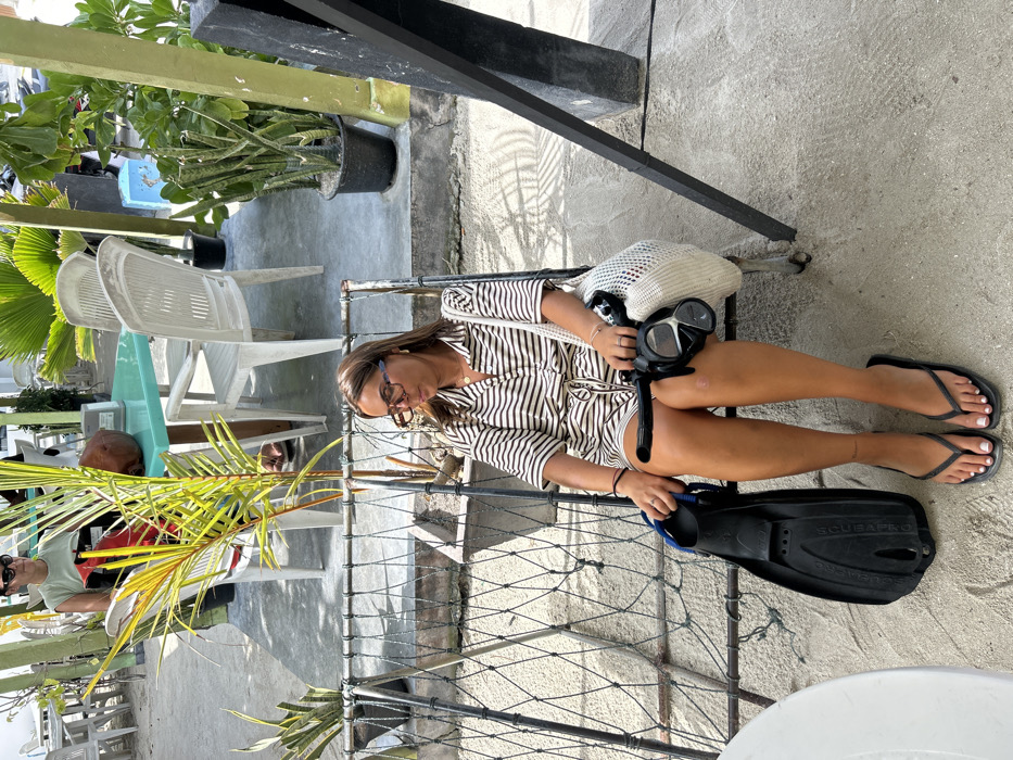 A woman with glasses sits on a chair, wearing a striped shirt and shorts, black flip-flops, and holding a snorkeling mask and flippers. Her white net bag hangs on the chair. Plants in pots are visible in the background. The seating area includes several chairs. The floor is concrete, and a metal structure leans to the side. Another woman is sitting at the table in the background.