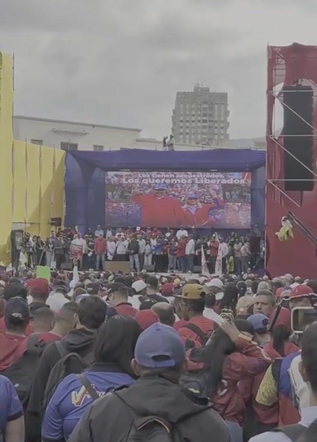 A crowd of people stands facing a stage that has a large screen displaying images of two men wearing red and blue outfits. The screen also has a message in Spanish that reads, "Los tienen secuestrados, Los queremos liberados," which translates to "They have them kidnapped, We want them freed." People in the crowd are wearing clothing with red, blue, and yellow colors, and some have backpacks. The sky above is overcast. Behind the stage is a building. A person is standing on the edge of the stage filming the event. The video is taken from the back of the crowd, looking toward the stage.