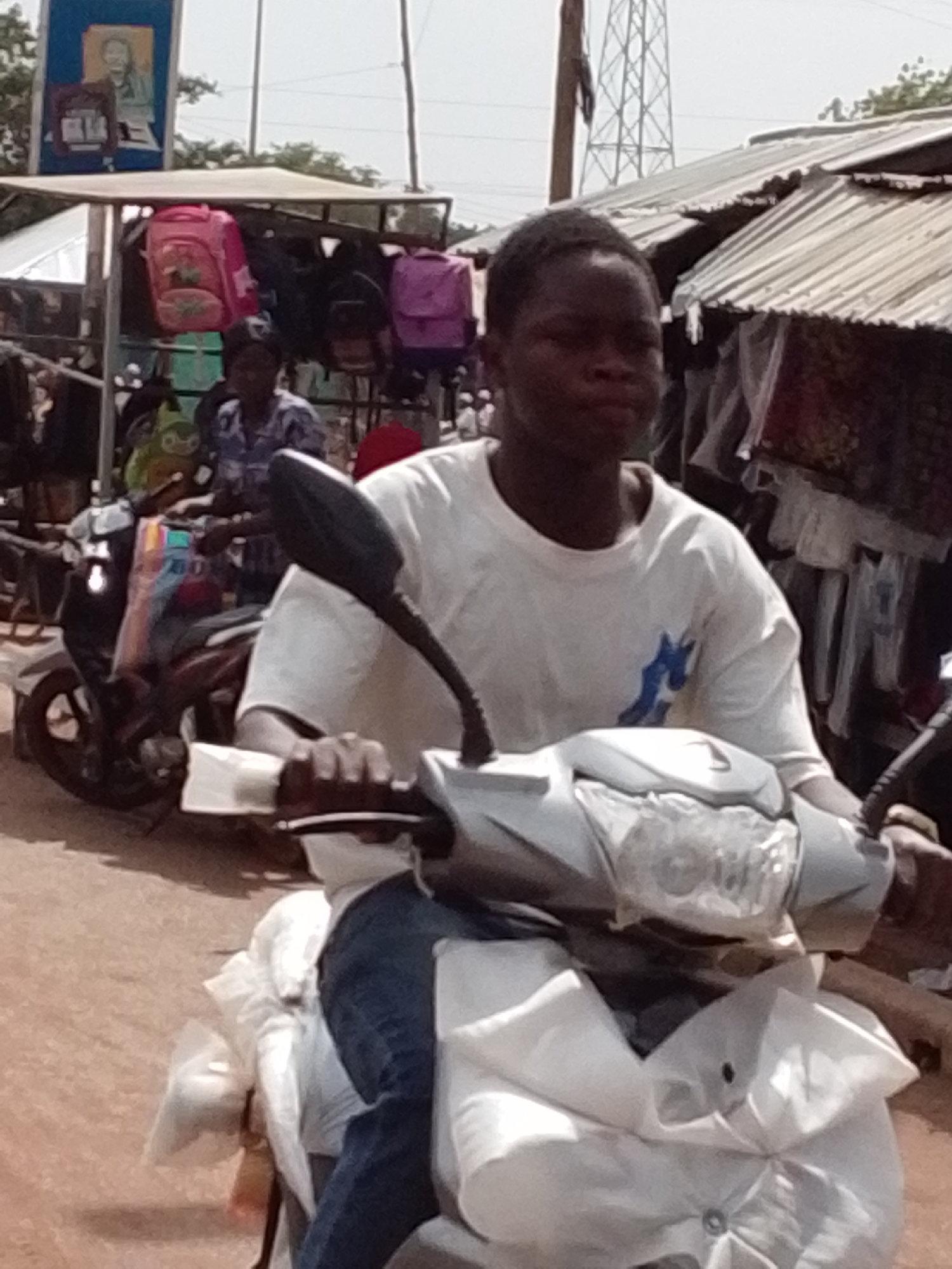 A young man rides a silver scooter on a dirt road in an urban area. The man wears a white t-shirt and blue jeans. White materials are bundled and secured around the scooter's front. In the background, a motorcycle is driven in the opposite direction. A makeshift structure displays school backpacks. A sign is visible above the backpacks. Tin roofs and a transmission tower are also in the background. Based on the context, it is inferred the location is in the city of Tamale, Ghana.