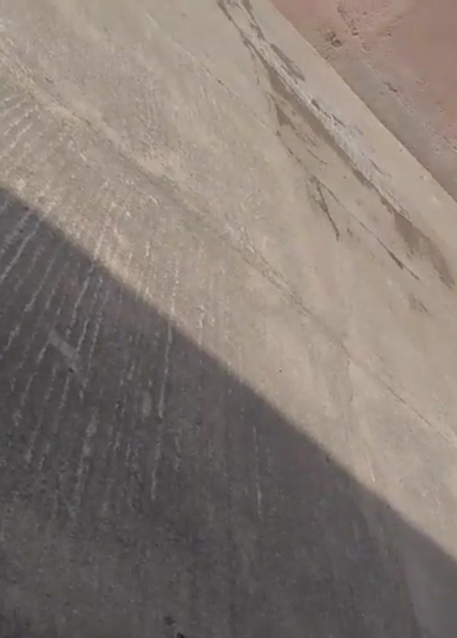 The camera points down at a concrete surface, possibly a rooftop, with several white pigeons walking around