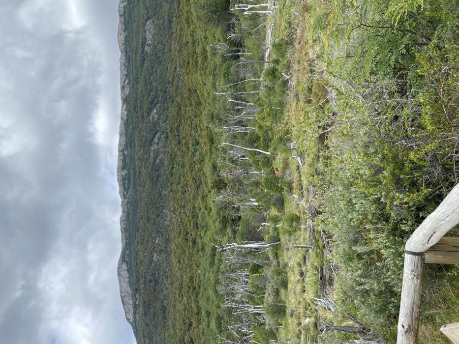 A lush, green mountainside slopes down, dotted with the stark white trunks of dead trees. A single brown fox stands amidst the verdant landscape. A weathered wooden railing sits in the foreground. A cloudy sky blankets the scene. The image conveys a sense of tranquility and the natural beauty of a mountainous region.
