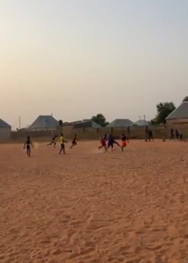 group of people playing soccer on a sandy field. The field is mostly flat and reddish-brown. There are several buildings in the background, including a couple of stone structures. The sky is light in color. There are a number of players on the field. They are wearing shorts and t-shirts. The players are running and kicking the ball.