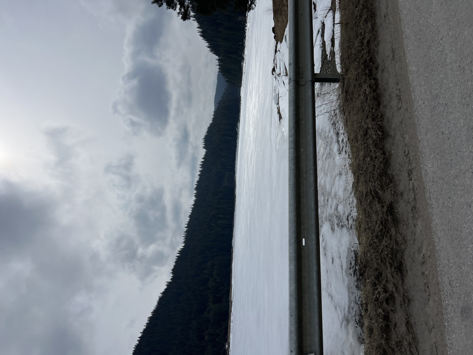 A panoramic view of Batak Lake near Sarnitsa, Bulgaria, is captured under a partially overcast sky with a bright spot indicating the sun. The lake's surface is covered with white ice and snow. Dense, dark green coniferous forests line the surrounding sloping hillsides, extending into the background. A grey metal guardrail with two visible rectangular bolt holes extends horizontally across the lower foreground, separating the lake from a roadside verge consisting of brown, dry grass, dirt, and melting snow patches. A dark grey paved road surface occupies the bottom of the frame. No human or animal subjects are present.