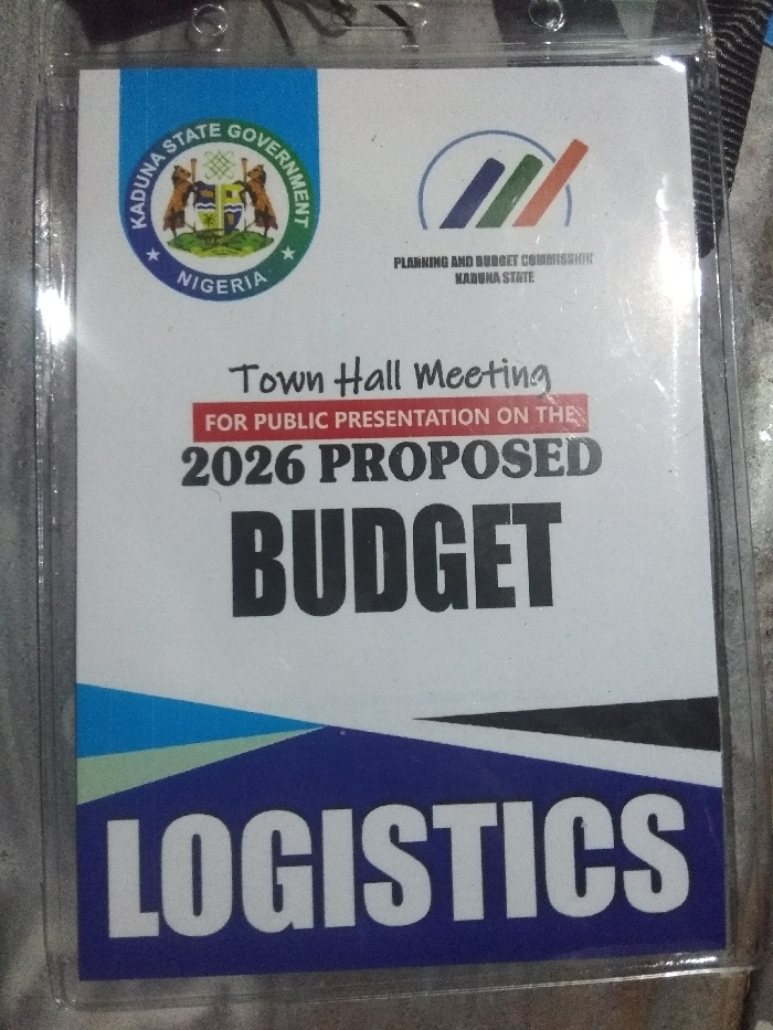 The image displays a badge, likely for a town hall meeting concerning the "2026 Proposed Budget." The badge features the Kaduna State Government logo of Nigeria and the Planning and Budget Commission logo. The text reads "Town Hall Meeting," "For Public Presentation on the 2026 Proposed Budget," and "Logistics" at the bottom. The design incorporates blue, green, and black lines and blocks of color. The badge is encased in a plastic holder.