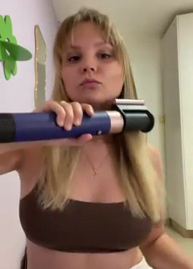 woman with long blond hair and bangs, wearing a brown tank top and white shorts, using a blue and black hair straightening device on her hair. She holds the device close to her face, showing the process of straightening a strand of hair. The background includes a lilac wall with a mirror and a green tree-shaped decoration. A white closet is visible in the background. The focus is on the woman and the hair straightening process.