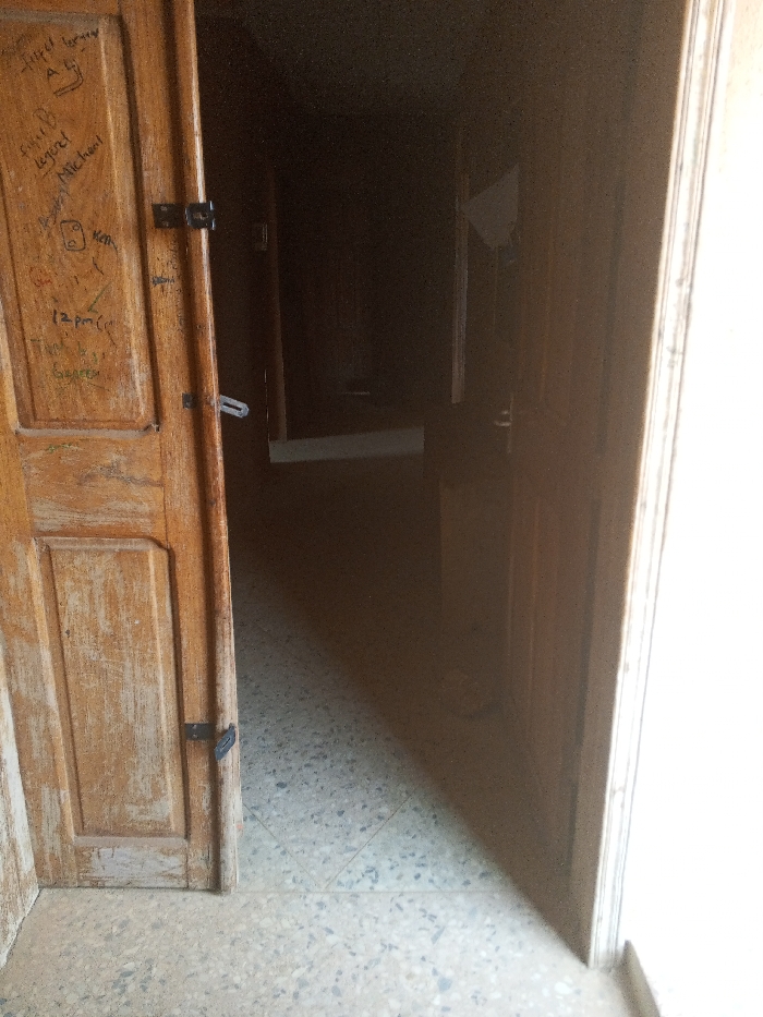 The image depicts an interior scene within a building in Oko Erin, Nigeria, looking through a partially open doorway into a dimly lit hallway or room