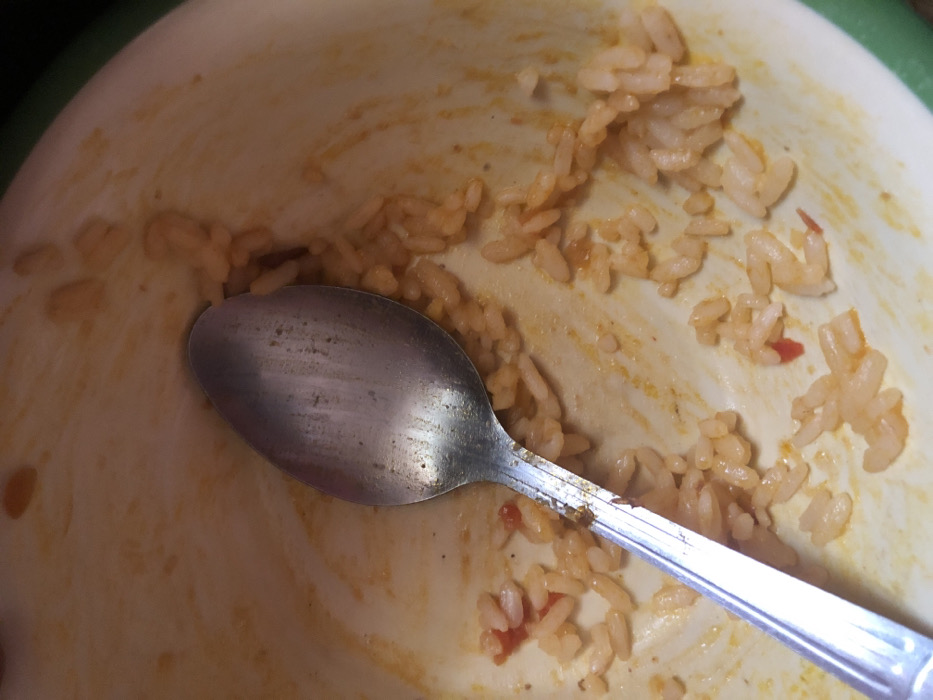 An overhead shot reveals a partially eaten bowl of rice mixed with bits of tomato