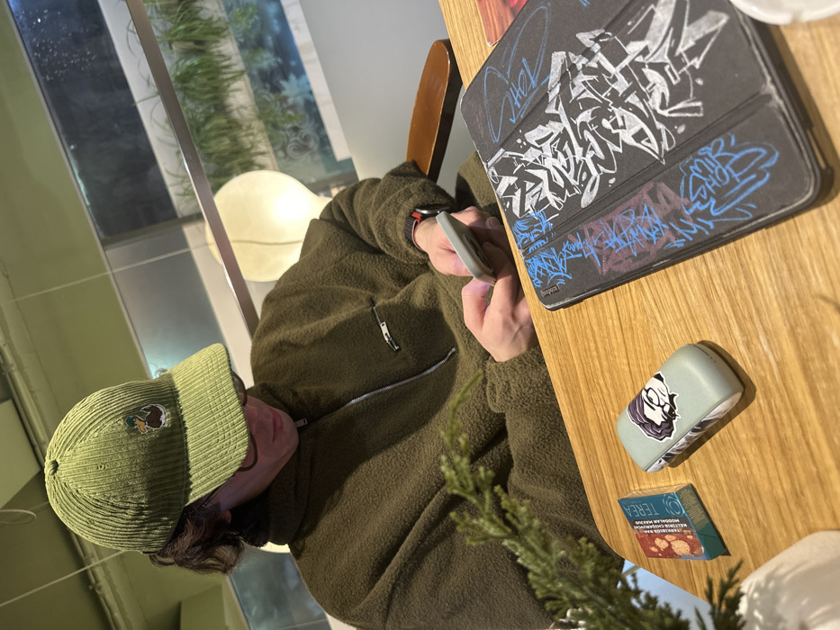 The scene depicts an individual seated at a light-colored wooden table in an indoor setting, identified as a cafe or similar establishment in Tashkent, Uzbekistan. The individual, seen from the chest up, wears a dark olive green corduroy baseball cap adorned with a brown and green duck emblem on the front, eyeglasses, and a dark olive green textured fleece half-zip pullover jacket with a small black zippered pocket on the left chest. Dark, wavy hair is visible below the cap. A watch with a red band is present on the individual's left wrist. Both hands are actively engaged with a light-colored smartphone. On the table, from left to right, are a small white ceramic pot containing green foliage, a blue and red rectangular package labeled "TEREA" with Cyrillic script, and a pale green device case featuring a sticker of a cartoon character with dark hair and glasses. To the right of these items lies a dark grey tablet case extensively covered in white and light blue graffiti-style tags. The background reveals a large window looking out onto a dark exterior, suggesting evening or night. Inside, beyond the window, green hanging plants are visible. A large, spherical, illuminated light fixture is prominent in the mid-background. A dark wooden chair back is partially visible to the right.