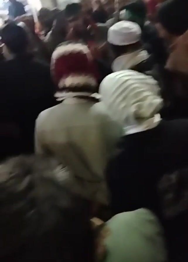 large crowd of people indoors, with many wearing hats or head coverings. The scene appears to be crowded and somewhat chaotic, with individuals moving around and the camera shaking slightly. The lighting is somewhat dim, and details are difficult to discern due to the density of the crowd. The people seem to be primarily of Asian ethnicity. The environment appears to be some sort of building, possibly a public space or a large hall.