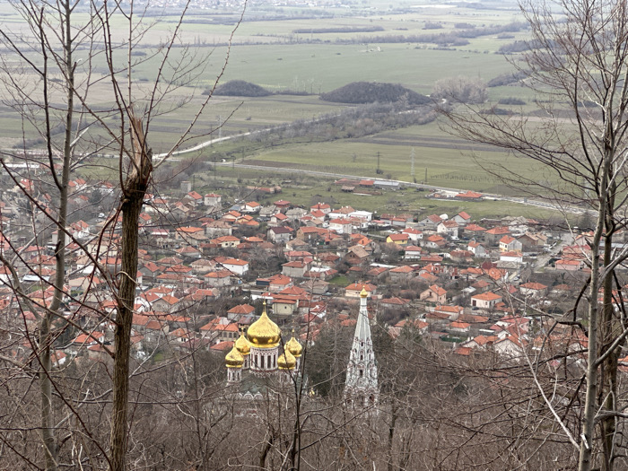 The image displays an elevated panoramic view overlooking the city of Shipka, Bulgaria, under an overcast sky, suggesting late autumn or early spring
