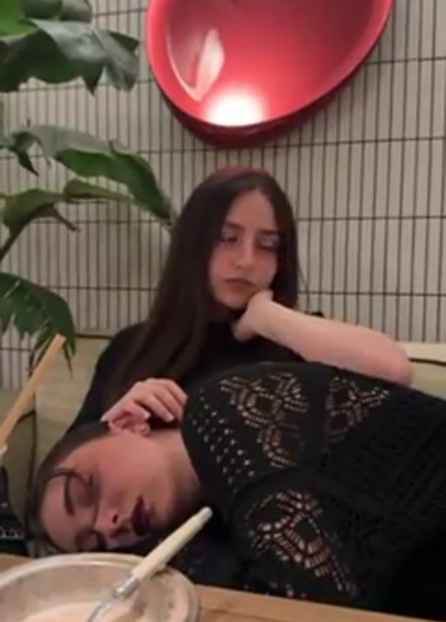 Two young women are at a restaurant. One is sitting up, wearing a black shirt, with long brown hair. The other is lying down with her head in the first woman's lap. She's wearing a black patterned shirt and has dark lipstick on. The first woman is looking off to the side and touching her hair. In front of them on the table is a bowl with something in it and a spoon. There's also a smartphone and a straw in a cup visible. Behind them is a wall with vertical white tiles, a large green plant and a red oval decoration.