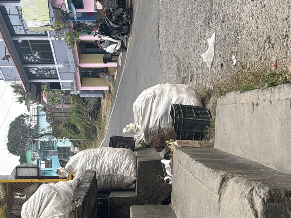 The image depicts a roadside scene in Kasar Devi, India, characterized by both human infrastructure and wildlife. In the immediate foreground on the left, a concrete structure, appearing as steps or a raised platform, is visible. Multiple large, white, bulky sacks, possibly filled with goods, are positioned on and around this platform. A dark plastic crate rests on the ground next to the platform, containing a small, light brown monkey looking towards the right. Another similar dark crate is partially visible further back on the platform. Scattered debris, including white plastic/paper and twigs, is present near the concrete structure. An asphalt road occupies the midground, extending from the lower left towards the upper right. To the right of the road, a two-story building with a light blue upper floor and a pink-painted lower section, accented with yellow, is prominent. This building features large glass windows on its upper level. Two motorcycles or scooters are parked directly in front of this building. A person is seated on a black chair near the parked vehicles, partially obscured by one of the scooters. A second monkey is observed perched on the roofline of this multi-colored building. In the background, hilly terrain rises, covered with sparse green vegetation and several trees, some appearing bare. Additional residential structures, predominantly light blue and pink, are scattered across the hillside. The sky is overcast.