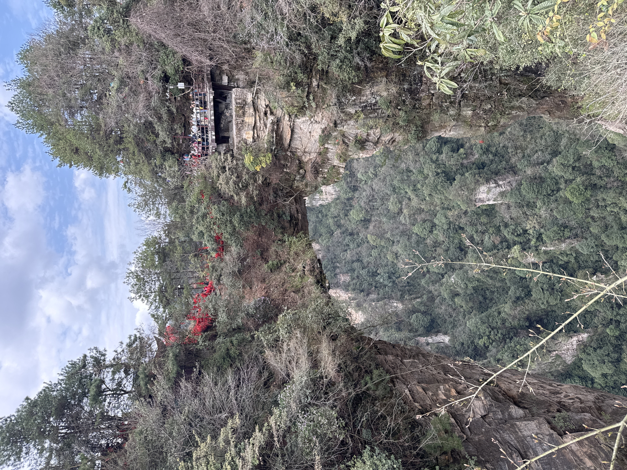 This image depicts a natural rock arch spanning a deep, verdant gorge in Luoguta, China. The arch, composed of layered rock formations, is centrally positioned, with sheer cliffs descending into a densely forested valley below. On the upper right cliff face, a wooden viewing platform with a dark railing is affixed. Approximately 20-30 individuals are visible on this platform, appearing to observe the scenery. The surrounding terrain on the cliff tops and upper slopes is covered with mixed vegetation, including tall coniferous trees and various deciduous shrubs and trees, some with bare branches and others with green foliage. Bright red fabric or ribbons are tied to several trees and bushes, particularly on the left upper cliff and near the viewing platform. The gorge floor is heavily forested, displaying a uniform canopy of green trees. The sky above is partially overcast with white clouds, interspersed with areas of light blue. The perspective is from a high viewpoint, looking down into the chasm and across to the opposing cliff.