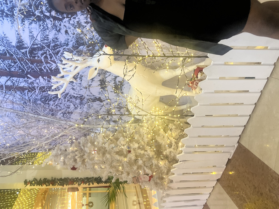 A rotated scene displays Christmas decorations. A white reindeer with prominent antlers stands among fairy lights and white, snowy foliage. A small white picket fence partially surrounds the display. A snowy forest backdrop is visible behind the reindeer. Christmas ornaments are seen on the tree and greenery hangs near the bottom. A woman is partially visible at the top.