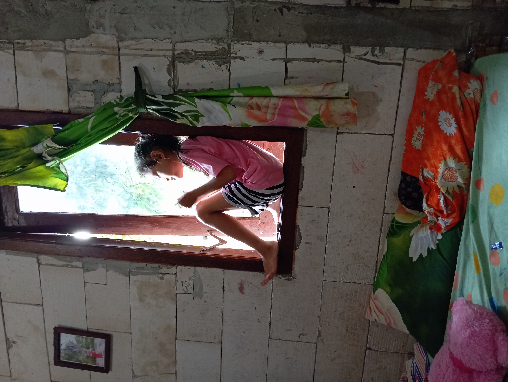 A young female, wearing a pink t-shirt and black and white striped shorts, is seated barefoot on the wooden sill of an open window in an unpainted room, located in the city of Baron, Indonesia