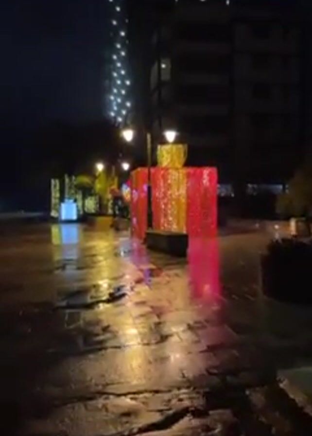 wet paved area at night, decorated with lighted gift box sculptures
