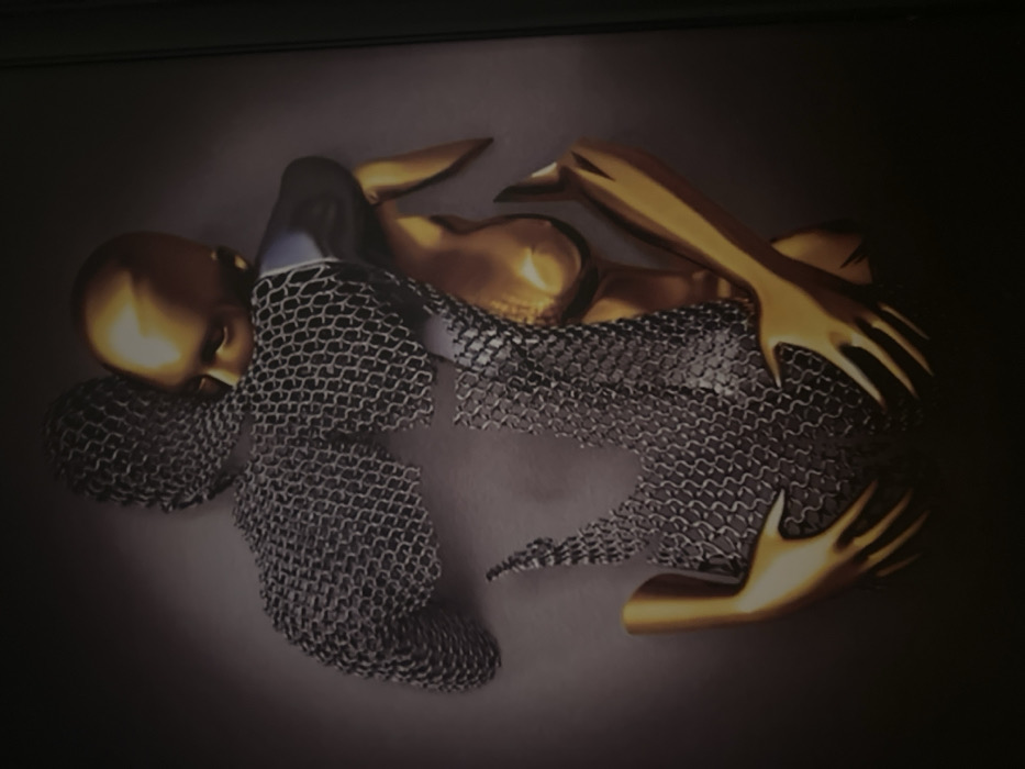 The image displays a photograph of a three-dimensional artwork depicting two stylized humanoid figures in an embrace. The figure on the right is smooth, metallic, and golden-bronze, presenting a featureless head, an upper torso with discernible breasts, and arms. Its head is tilted and pressed against the other figure's shoulder. The figure on the left is composed of dark silver-grey chainmail, forming a fragmented upper torso, head, and arms. The chainmail figure's arms are wrapped around the golden figure's upper body. Simultaneously, the golden figure's arms embrace the chainmail figure's lower torso. The background is a dark, gradient field, suggesting a studio or display setting. Directional lighting illuminates the figures, creating highlights on their metallic surfaces. The specific location in the city of Dushepe, Nigeria, is not discernible from the visual information presented.