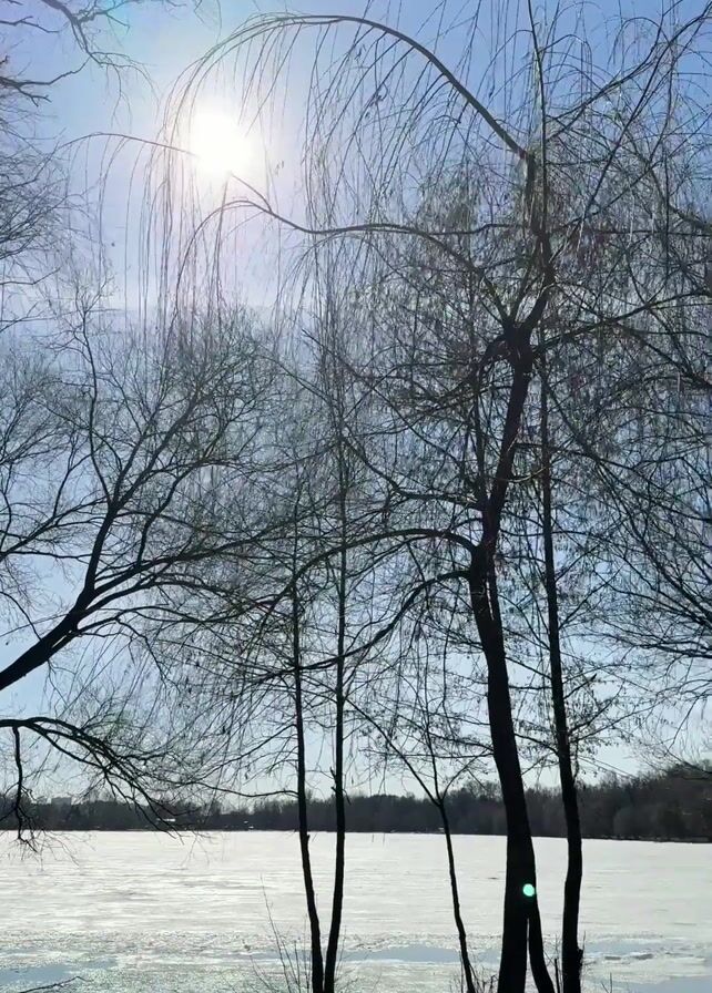 The video begins with a view of a sunlit, ice-covered lake framed by bare trees against a bright blue sky