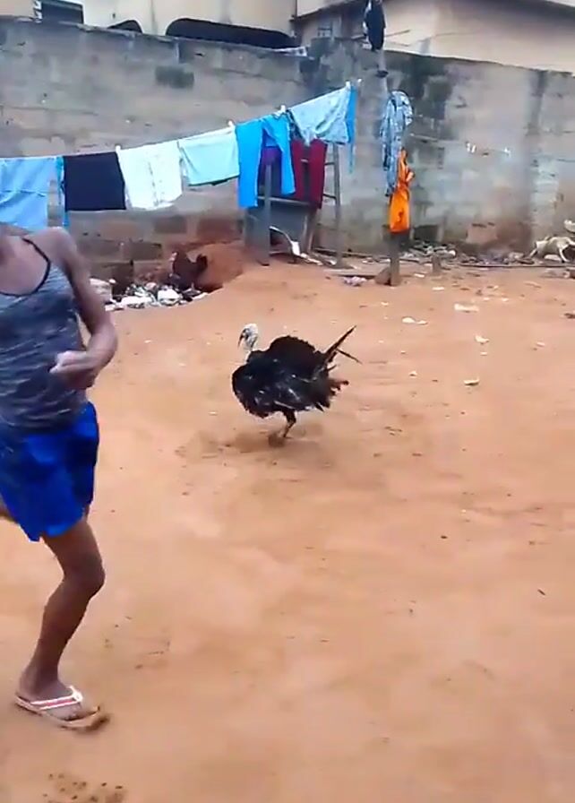 A young person is running around a dirt yard, chasing a turkey. There are also several chickens present. A clothesline is visible in the background with laundry hanging on it. The surrounding area includes a brick wall and buildings. The video was taken with a Tecno Pop 7 phone.