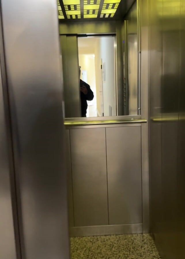 A person inside an elevator looks toward the elevator door. The elevator door opens and reveals the person reflected in the mirror within the elevator. The interior of the elevator has a silver paneling. The elevator is brightly lit from above with a checkered pattern. The floor of the elevator has a speckled pattern. The person wears a gray shirt and black jacket and holds a black cell phone. The hallway outside the elevator is brightly lit.