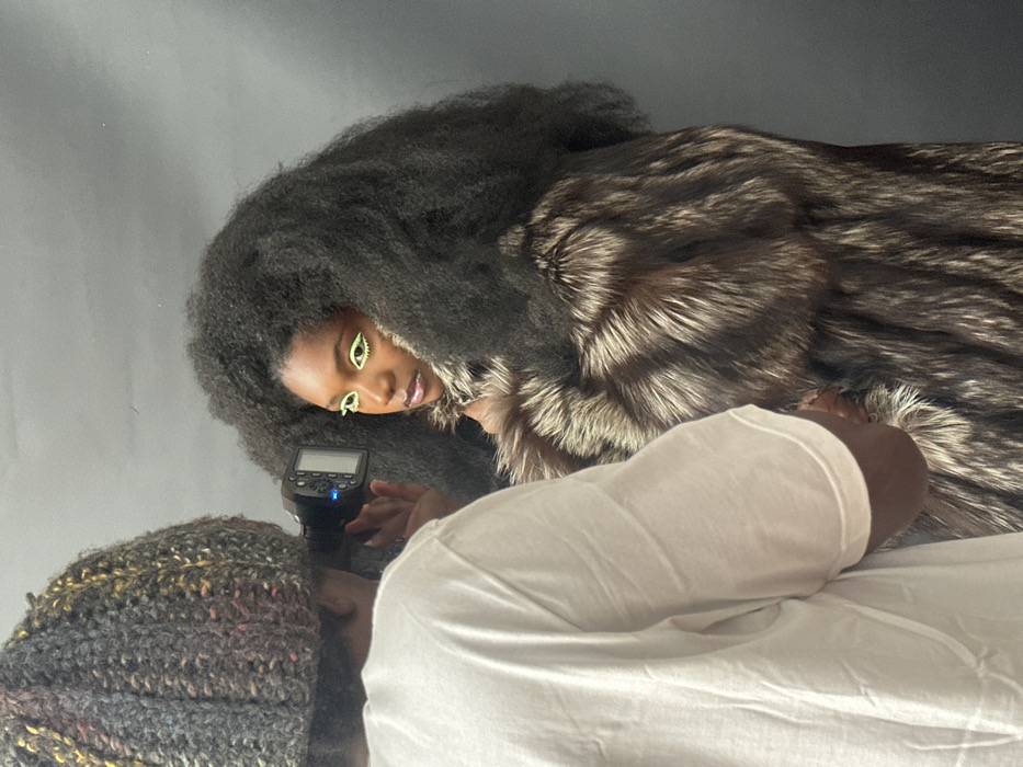 This image captures a studio photography session occurring in Cachan, France. In the immediate foreground, a dark-skinned individual, wearing a multi-colored knitted beanie and a white short-sleeved t-shirt, holds a camera equipped with an external flash unit to their eye, directed towards the subject. The flash unit displays a blue indicator light on its rear. In the midground, a dark-skinned female model is depicted from the chest up, posing with her head slightly tilted and gaze directed to the left. She exhibits voluminous, dark Afro-textured hair that frames her face. Her makeup prominently features vivid neon green eyeliner defining both upper and lower lash lines, complemented by glossy, reddish-brown lips. The model is clad in a luxurious fur coat, characterized by a pattern of dark brown/black fur with striking silver-white tips. The background consists of a plain, dark gray surface, indicating a controlled studio setting.