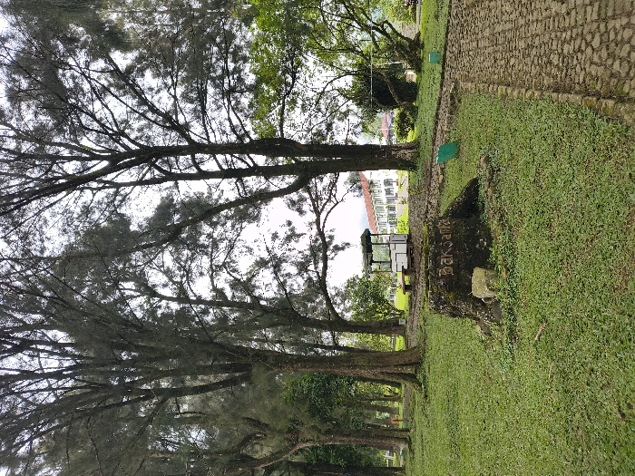 A park setting is viewed from a ground-level perspective. Towering trees, with dense foliage, line the foreground. A stone wall borders the right side, and lush green grass covers the ground. In the distance, a building with a white facade and dark roof is visible. A small structure with benches and a table sits amid the greenery. A rock with writing on it, partially obscured by moss, is a focal point.