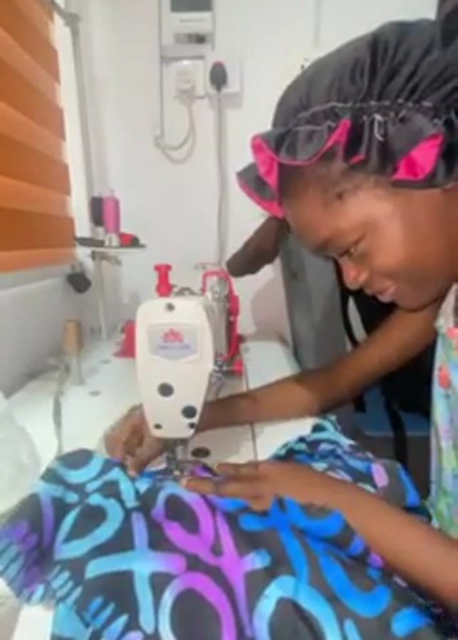 A young woman with a black and pink hair bonnet is using a sewing machine