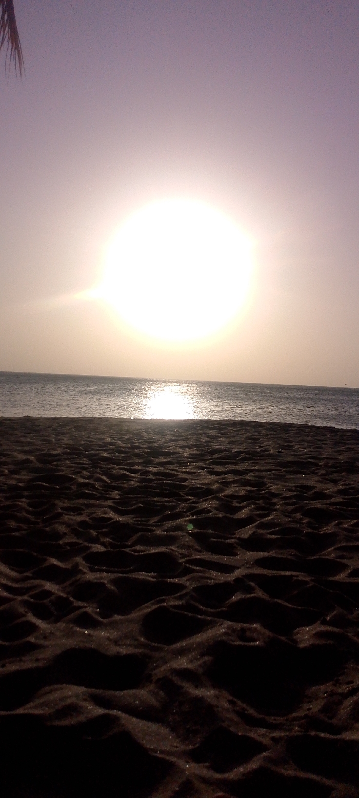 The image depicts a beach scene in Juan Griego, Venezuela, at either sunrise or sunset. The horizon line divides the frame horizontally, separating the ocean from the sky. A large, intense, circular sun, appearing bright white with a yellow hue, is positioned centrally just above the horizon, casting a prominent, shimmering reflection path across the water directly towards the viewer. The sky above is a hazy light purple, gradually transitioning to a brilliant white and yellow glow around the sun. The ocean is a dark blue-grey with visible surface ripples from the sun's reflection. The foreground, occupying approximately the bottom half of the image, consists of dark, undulating sand, textured with numerous wave-like patterns and primarily in shadow, though faint glints of light are visible on some elevated grains. A few dark, spiky palm fronds are partially visible in the extreme upper-left corner of the frame. No individuals, distinct objects, or specific actions are present.