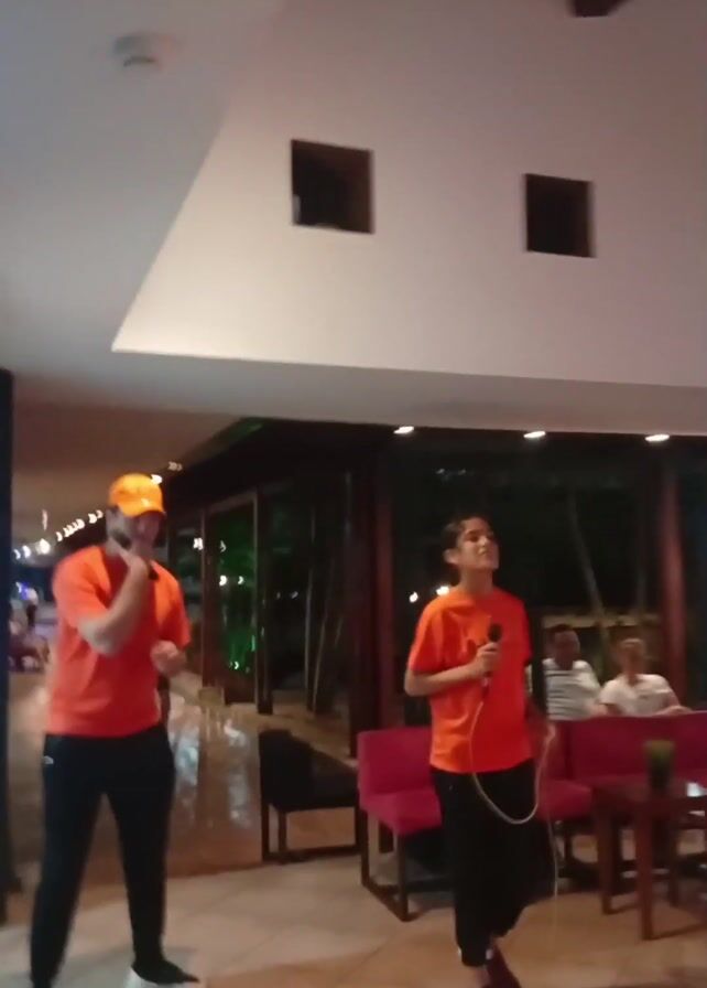 Two people in matching orange shirts and black pants are performing karaoke indoors. The male performer wears an orange baseball cap. They are both holding microphones and dancing slightly. There are some seated people in the background and a decorated patio behind them. The room has a modern design with dark wood and white walls.