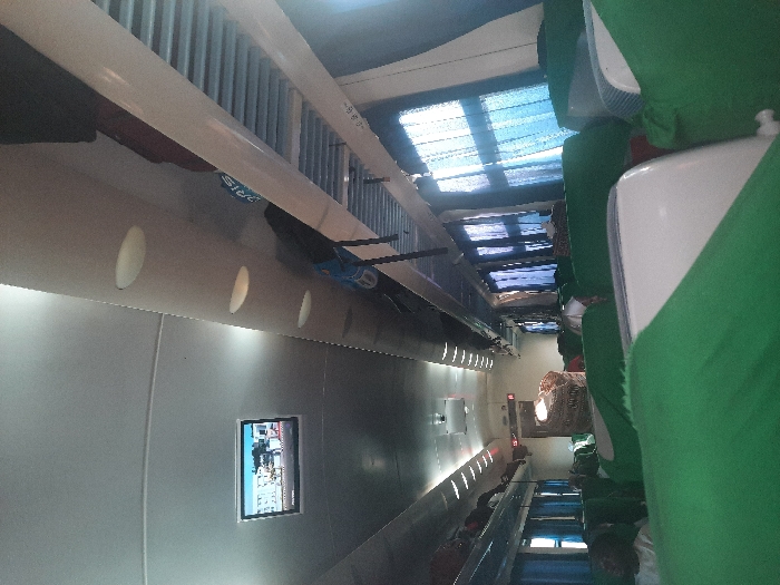 The scene depicts the interior of a passenger train car in Afaka, Nigeria, viewed from a slightly elevated, forward-facing perspective. The car features rows of seats, primarily covered in green fabric, with white plastic seat backs visible. Overhead luggage racks run along both sides of the cabin, holding assorted baggage including blue, black, and red items. A flat-screen television monitor is mounted on the ceiling towards the left, displaying an outdoor scene with buildings and what appears to be a street. Recessed circular and linear strip lights illuminate the ceiling. Windows with light blue curtains are visible along both sides of the train car, allowing natural light to enter. Several individuals are seated throughout the car, partially visible behind the seat backs. A doorway is visible at the far end of the aisle, with a large, patterned object positioned nearby.